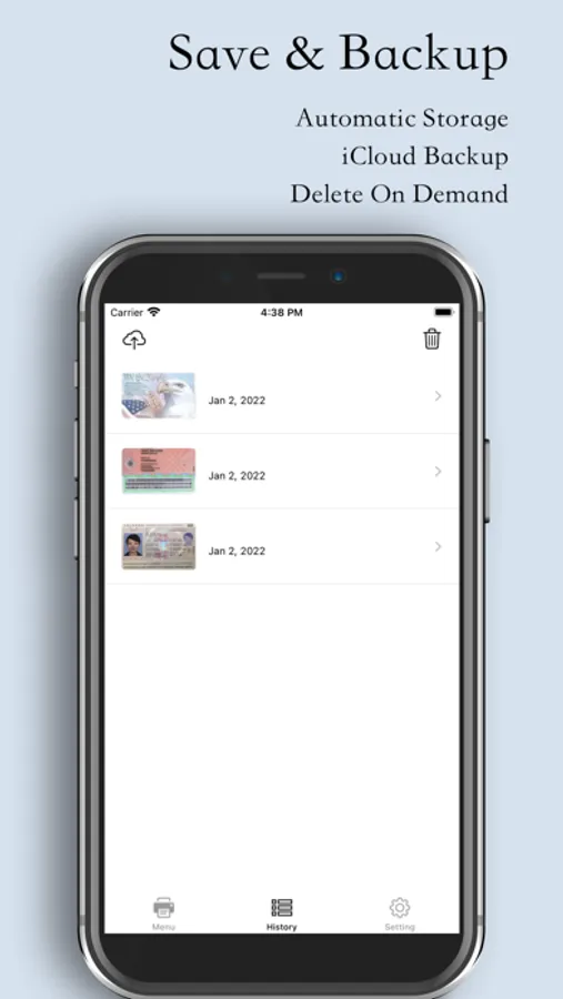 After version 2.2, the iCloud backup function was added at the request of some users. The technology used was provided by Apple CloudKit. For ID pictures generated before version 2.2, users need to manually open the pictures to be backed up once, and then perform iCloud backup. The picture files backed up to iCloud can be seamlessly viewed and used using the "File" that comes with iOS or the Finder (Go→iCloud Driver) that comes with Mac.
