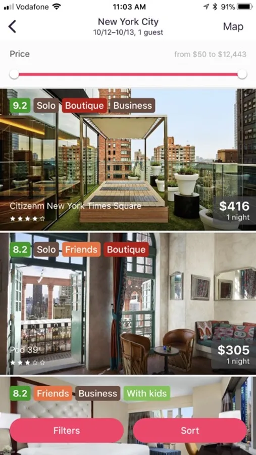 -Sort hotels by popularity, distance from the downtown area (or any other place you choose), price, rating.