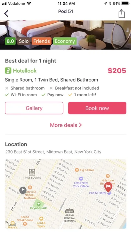 You have access to all necessary information about the selected hotel, such as photos, a list of additional services, details, reviews.
