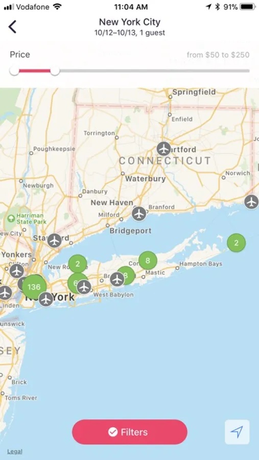 -Map of the hotels found, as well as the downtown area and the nearest airport.