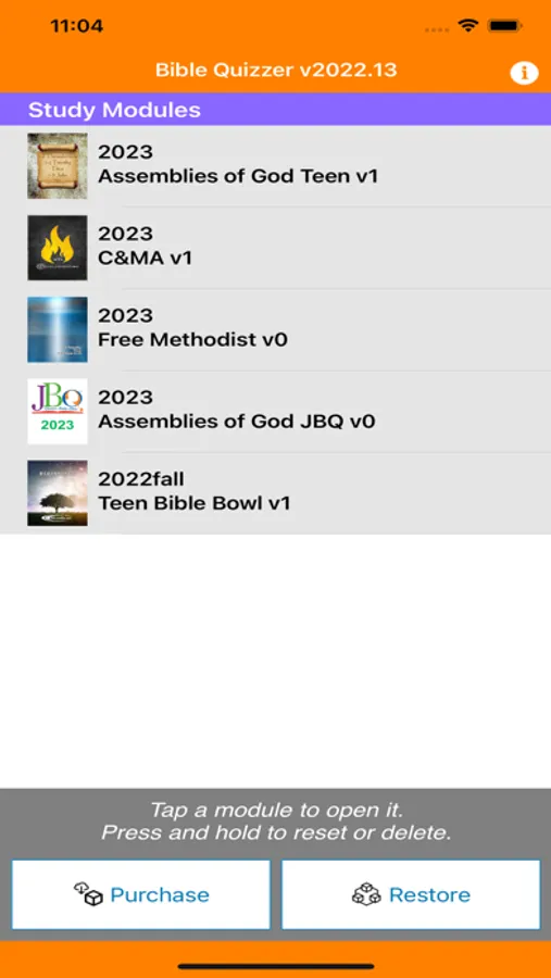 NOTE: This free app does not come with any Scripture modules. You must purchase Scripture modules to access the features. Modules are available for: National Bible Bowl, C&MA, Bible Quiz Fellowship, AACS, Assemblies of God, Junior Bible Quiz, Free Methodist, MASCA, Nazarene, and Salvation Army.