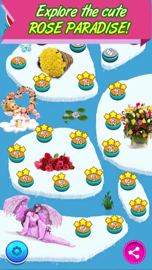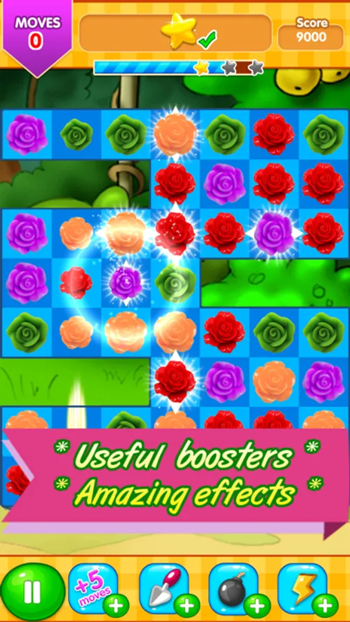 + Link 3 or more roses to get score, collect roses, clean blocks, earn stars...