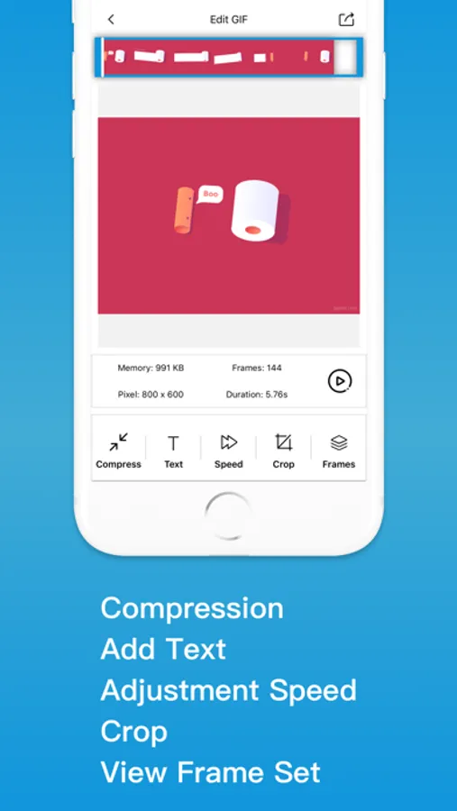 - GIF compression, cropping, adding text, adjusting double speed, adjusting frame set