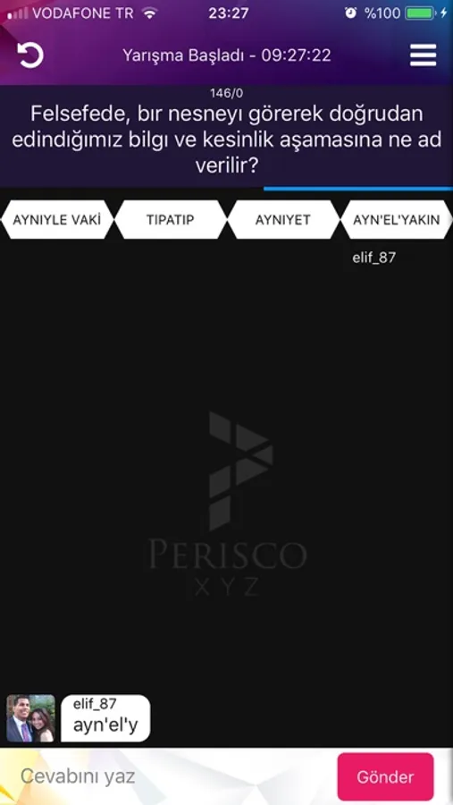 Birçok televizyon yarışmasında olduğu gibi bir bilgi yarışma düşünün. Ve şimdi onu aynı anda arkadaşlarınızla, tanıdıklarla ya da yabancılarla oynadığınızı düşünün. Aynı zamanda sohbet ederek güzel vakit geçirebileceğiniz bir bilgi oyunu. İşte Perisco XYZ Bu.