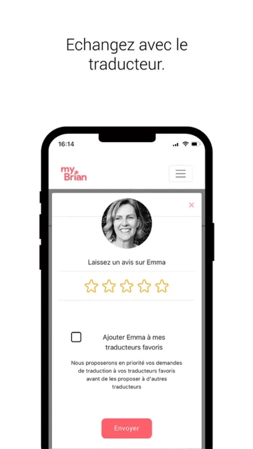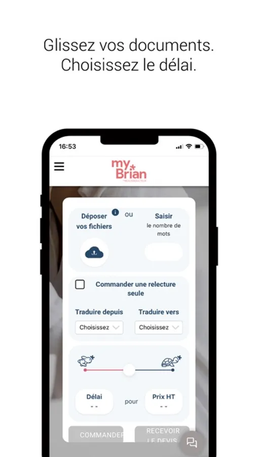 Avec MyBrian, vous choisissez votre délai en fonction de l'urgence et de votre budget et nous vous trouvons le meilleur traducteur professionnel.