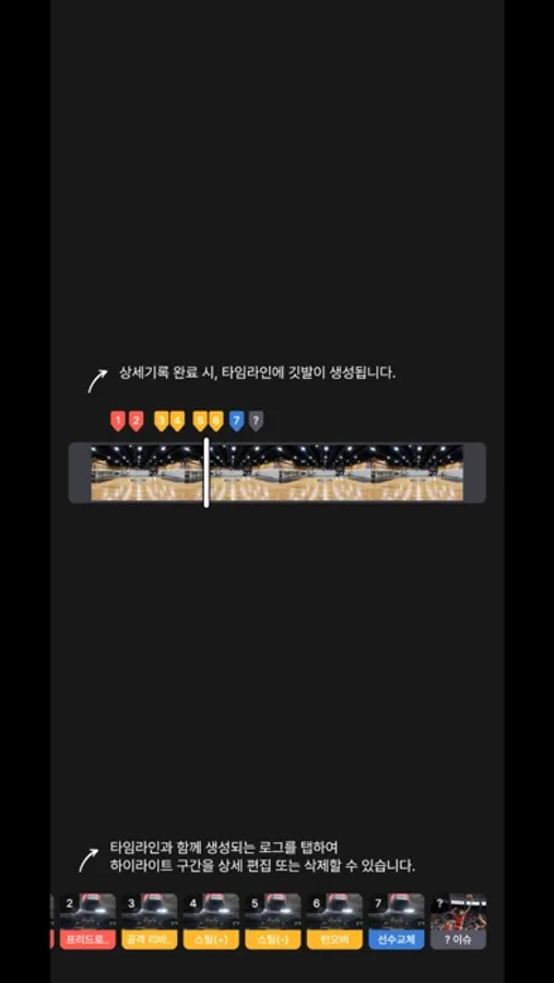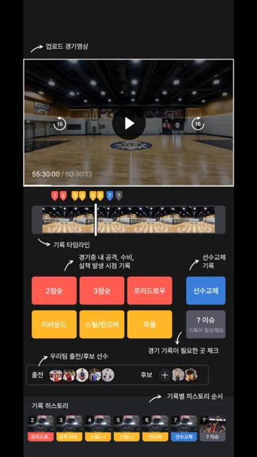 - 팀원 분들이 함께 조금씩 나누어서 기록을 하실 수 있게 도와드릴게요! 쿼터 별로 다른 분들과 나누어서 기록을 하실 수 있어요. 저희가 추천해 드린 주요 장면을 위주로 기록을 하시면 오래 걸리지 않으실 거에요!