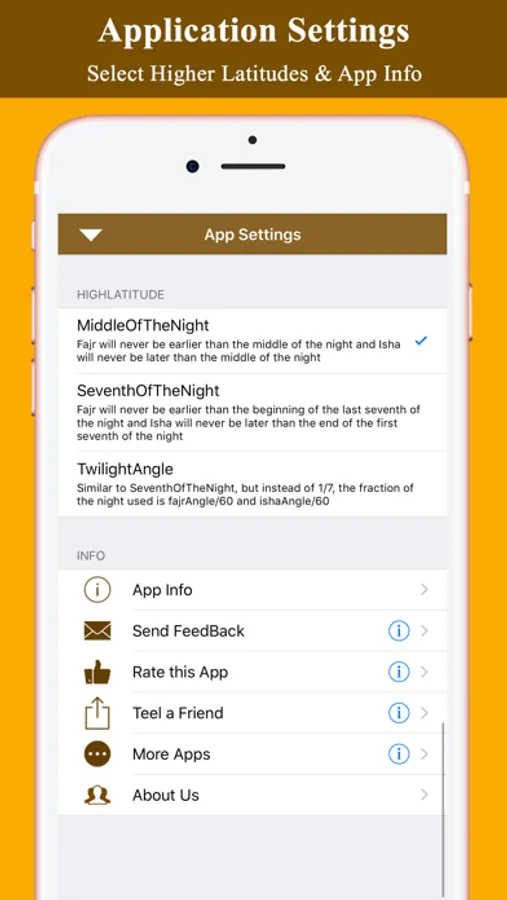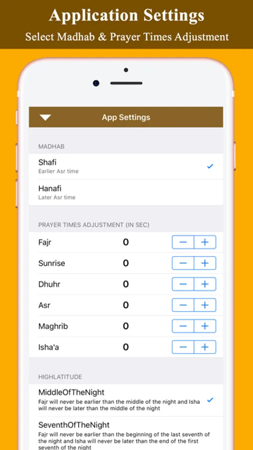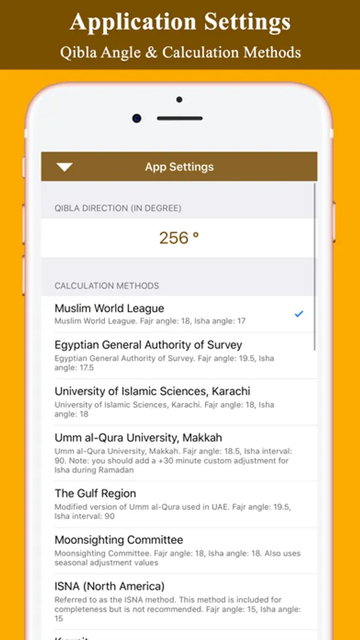 5. Settings options: Calculation Method, madhab, Higher Latitude Rule, Prayer Time Adjustment and much more