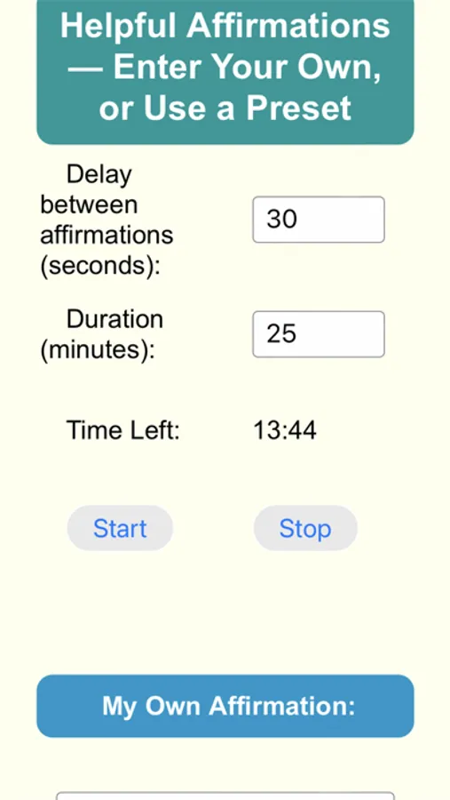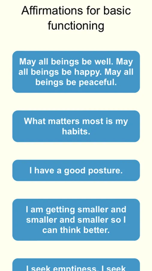 This is a very helpful app for repeating important statements you want to remember so you can change yourself and hold ideas. There are many built-in affirmations, and you can type in your own and the computer will speak them as often as you wish for as long as you wish. Thanks!