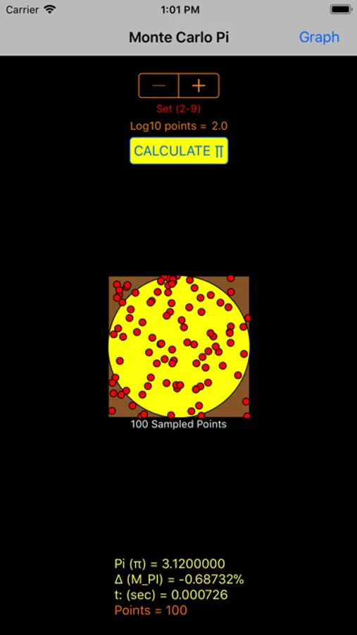 This app generates a total number of random points ranging over seven orders of magnitude. It enables the user to see the value of pi evolve through plots of pi, and delta, the percentage difference between the calculated pi value and the value of pi stored in the computer. It also presents a scatter plot of sampled points to aid in visualizing the process, and calculates how long it takes for your device to generate the random points and do the calculation.
