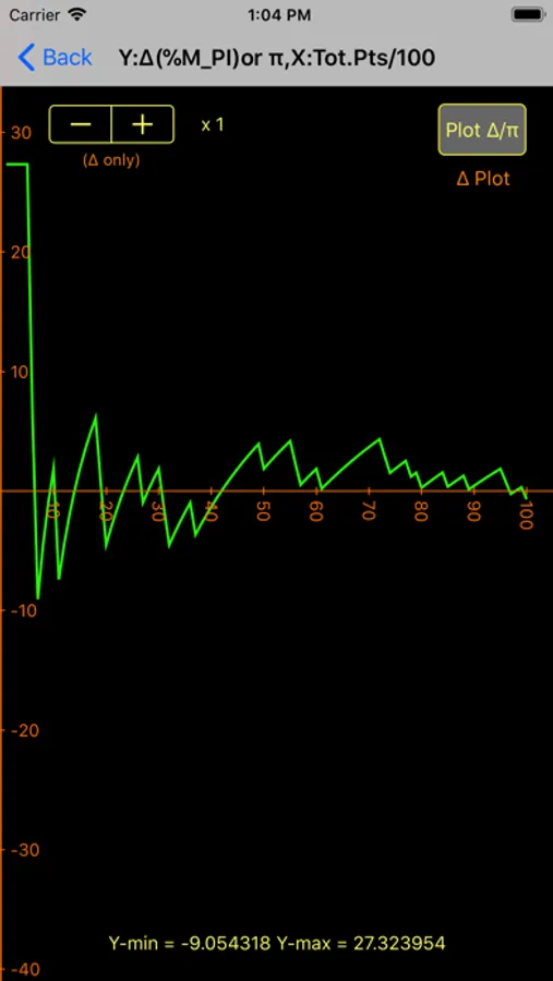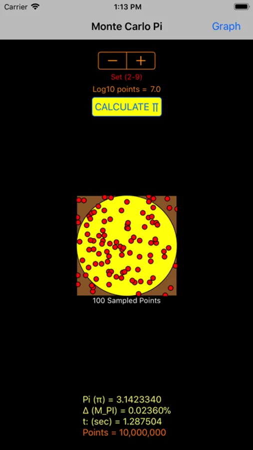 If you dislike your graph adjustments, toggling the Back/Graph button resets the graph to original values, without re-calculating pi.