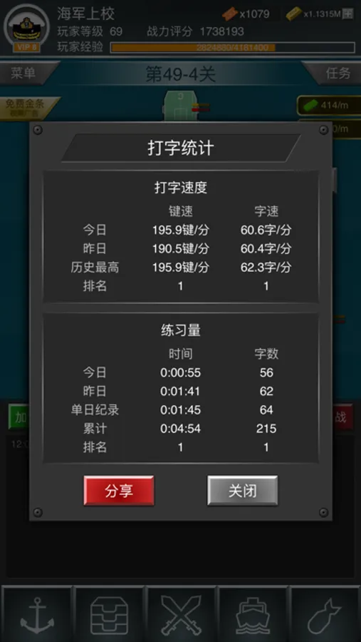 • 打字练习数据统计。看看数据就知道,熟能生巧不是假话