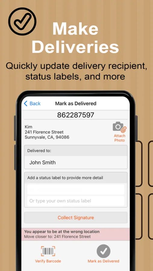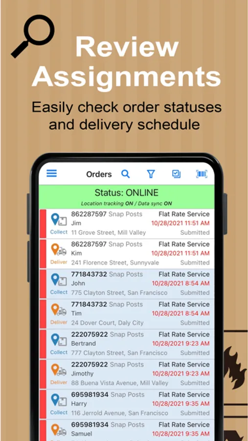 BARCODE SCANNING: Use the camera on your device to quickly read a barcode from any label. The app will find the corresponding order on your list and offer appropriate actions.