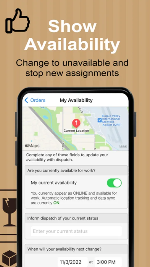 SIGNAL AVAILABILITY: Keep dispatch informed where you are at, when you are available, and when you expect that to change. Great for independent contractors!