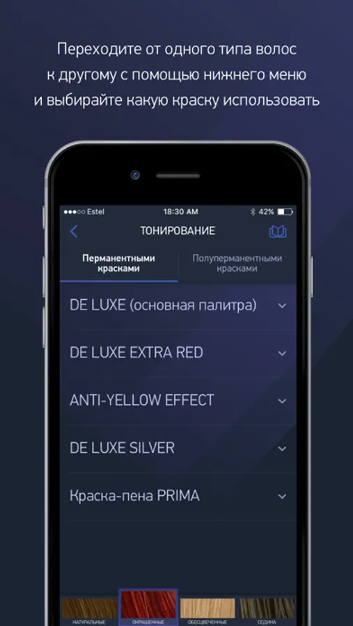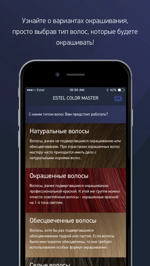 • ESTEL Color Master запоминает, где Вы остановились в каждом разделе. Поэтому Вы всегда можете быстро вернуться в любой из типов волос через нижнее меню и посмотреть именно ту формулу, которая Вас интересовала. Это особенно удобно, когда у Вашего клиента волосы разного типа, например, натуральные на корнях и окрашенные по длине.