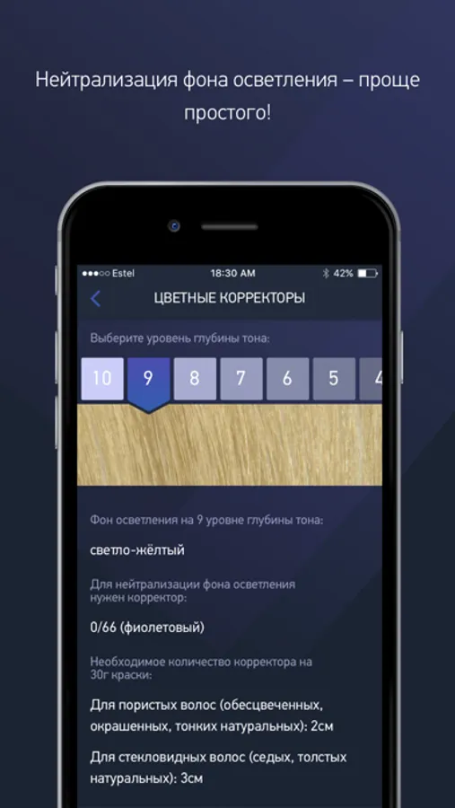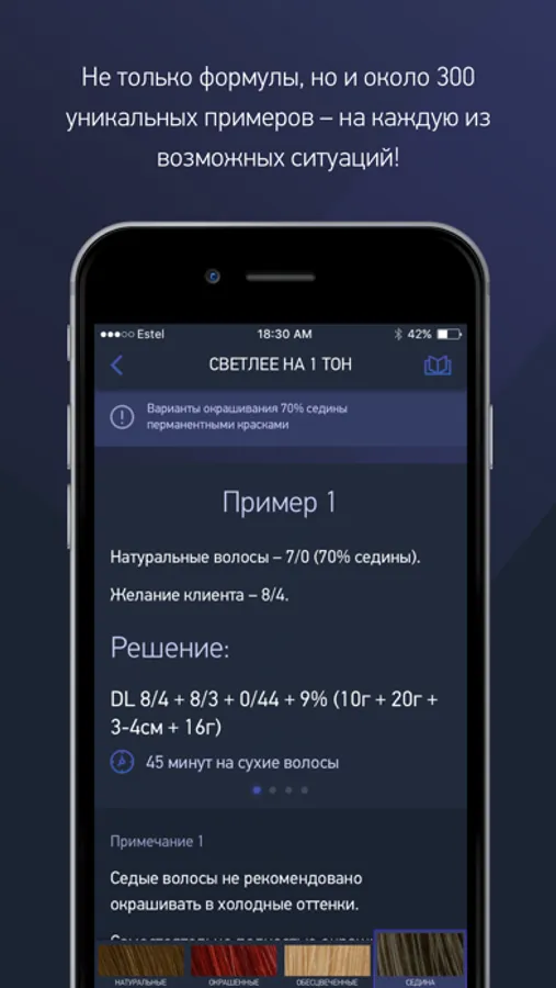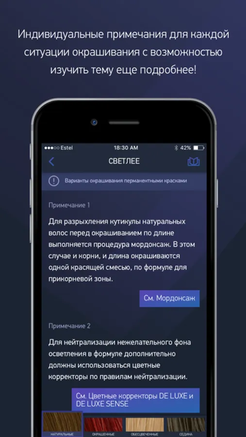 Удобное построение информации в приложении по колористике для парикмахеров ESTEL Color Master позволит Вам легко разобраться как можно получить желаемый цвет волос, с помощью каких красок, на какие детали стоит обратить внимание, нужно ли добавлять цветные корректоры и сколько, посмотреть разные примеры.