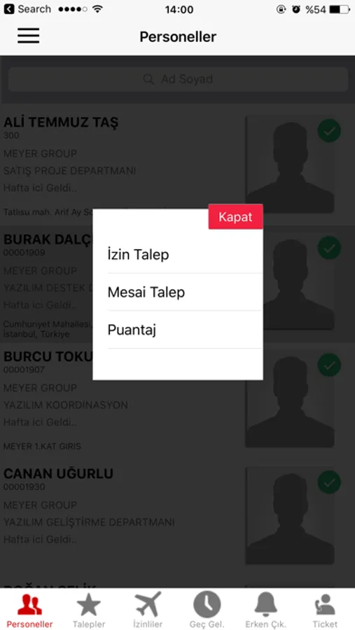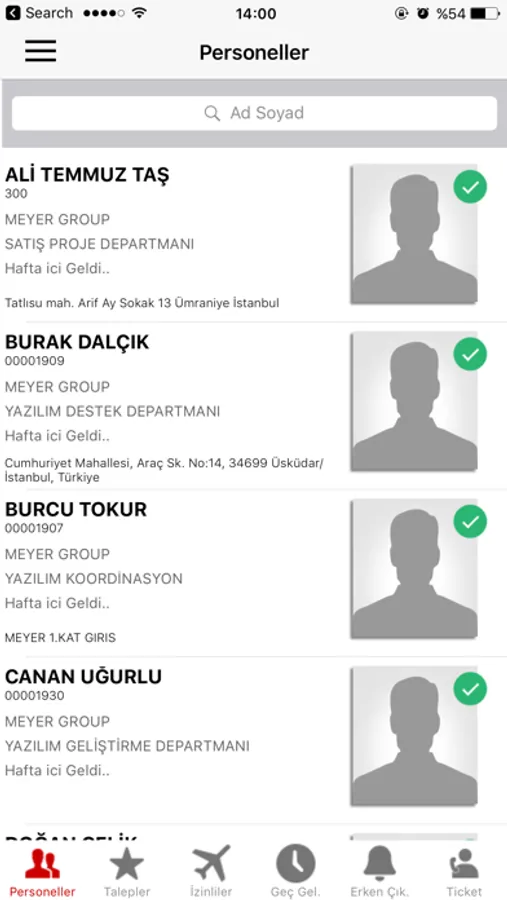 - İzinli, Geç Kalan ve Erken Çıkan personelleri görebilir