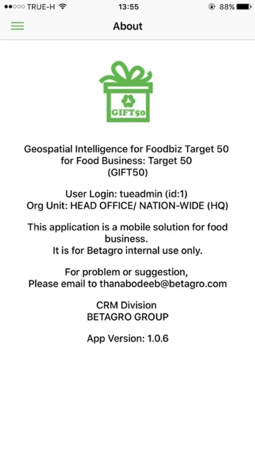 GIFT50 (Geospatial Intelligence for Foodbiz Target 50) เป็นเครื่องมือเพื่ออำนวยความสะดวกในการสำรวจร้านค้าที่อยู่ในธุรกิจอาหาร (เช่นภัตตาคาร หรือ โรงแรม) โดยสามารถค้นหาร้านค้าได้ทั้งประเทศไทย และสามารถเลือกดูตาม channel และพิ้นที่ที่ต้องการได้ ผู้ใช้งานสามารถ ทำ survey ร้านค้า, ระบุ pocket size แยกรายสินค้า, เพิ่มหรือแก้ไขข้อมูลร้านค้า และ ส่งข้อมูลกลับมาประมวลผลได้