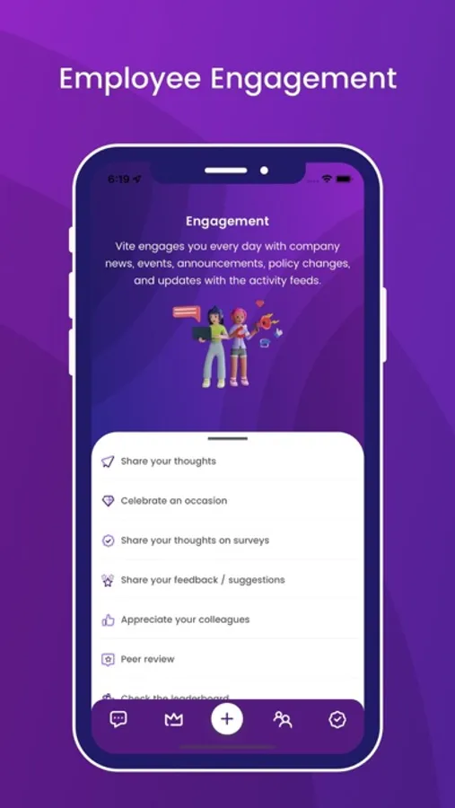 Vite provides engagement feeds to share information every day on company news, events like birthdays and work anniversaries, announcements, policy changes, and health updates with the activity feed. Employees can engage others by posting, reading, or commenting on the company’s social feeds.