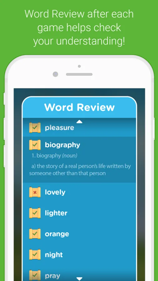 At the end of every game, our Word Review screen lets you study the definitions for the words in that game.