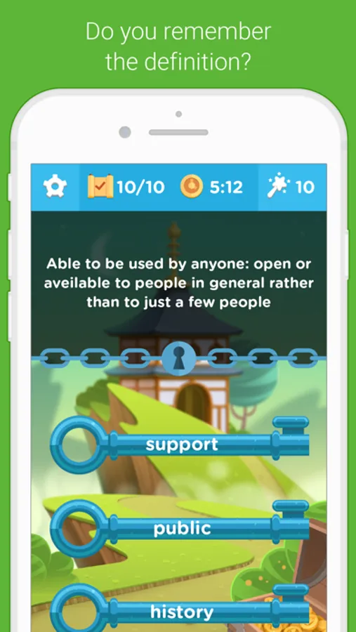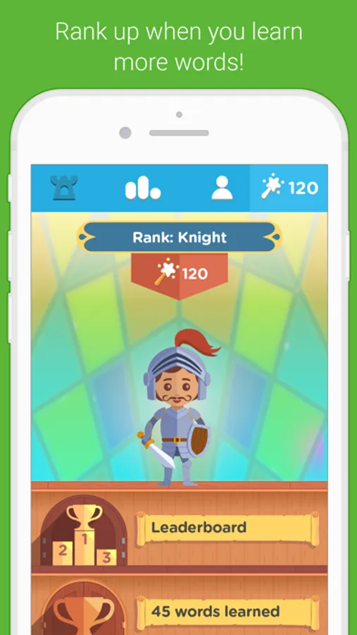 Visit the Progress Room to check your progress, see the words you’ve learned, and study word definitions! Increase your rank (from peasant to emperor!) by learning new words! View the Leaderboard to compete with your friends!