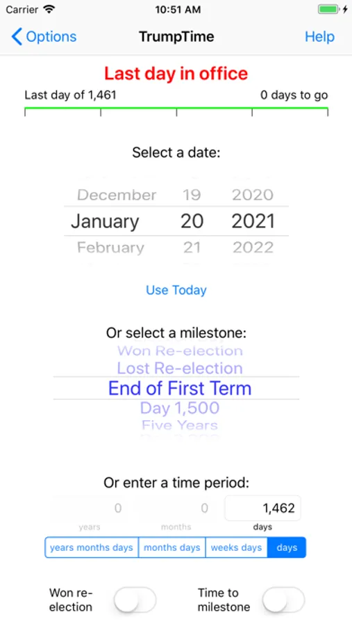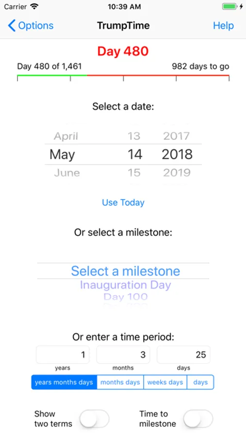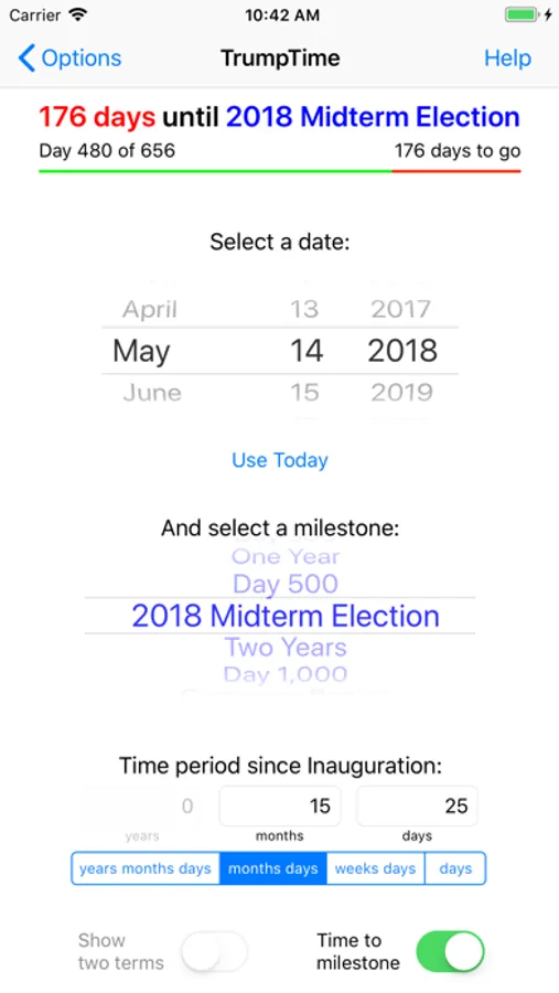 Want to know the time until a milestone? Turn on "Time to milestone", select today or any date, and select a milestone, such as the 2018 Midterm Election. The display shows the days from the date until the milestone.
