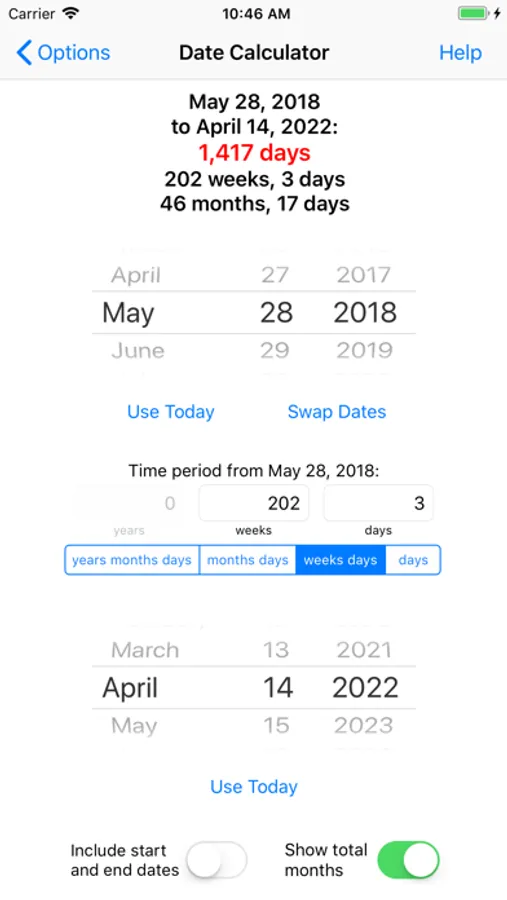 TrumpTime includes a general date calculator. Open the calculator and pick any two dates to display the time between them. Or, find the date that is a given time period before or after a known date; for example, find the date that is 17 weeks and 4 days after today. You can enter formulas as the time period using the four arithmetic operators +, -, × and ÷, and you can chain multiple operations together. For example, you can calculate the date that is 7 × 29 + 3 months after a known date.