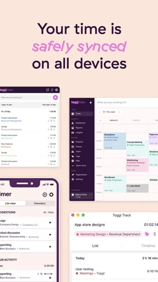 Keeps your time seamlessly synced, safely saved, and ready to track on your account, on any device.