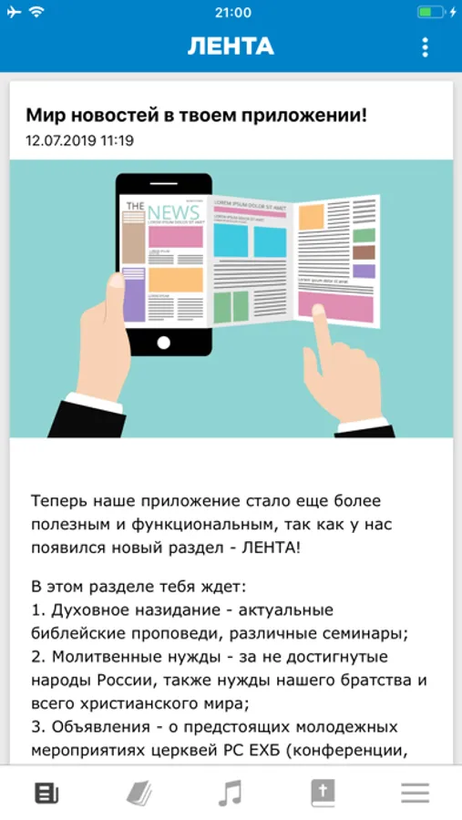 Содержит блокнот для записи уроков, сборник песен с аккордами, молитвенный дневник, тематический план чтения священного писания по теме недели и ленту новостей РСЕХБ. Приложение рассчитано на все годовые курсы и не требует дополнительных установок.