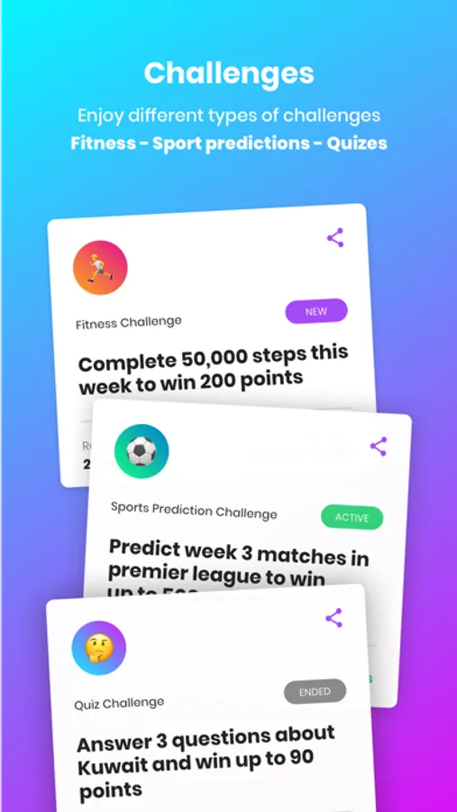 • Join a variety of Challenge from Football predictions, Quizzes and Exclusives to earn points for free.