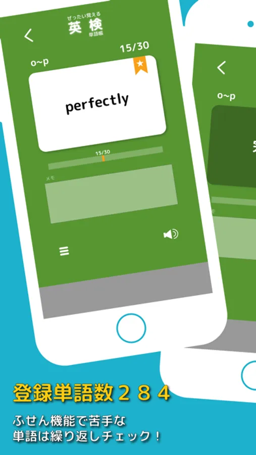 284個の英単語をフォルダでまとめてあるので、少しずつ、確実に単語を覚えることができます。覚えられない単語には付箋をつけて、苦手な単語のみを集中して復習することもできるので、とっても便利。シャッフル機能も使えば、より確実に単語を覚えることができます。