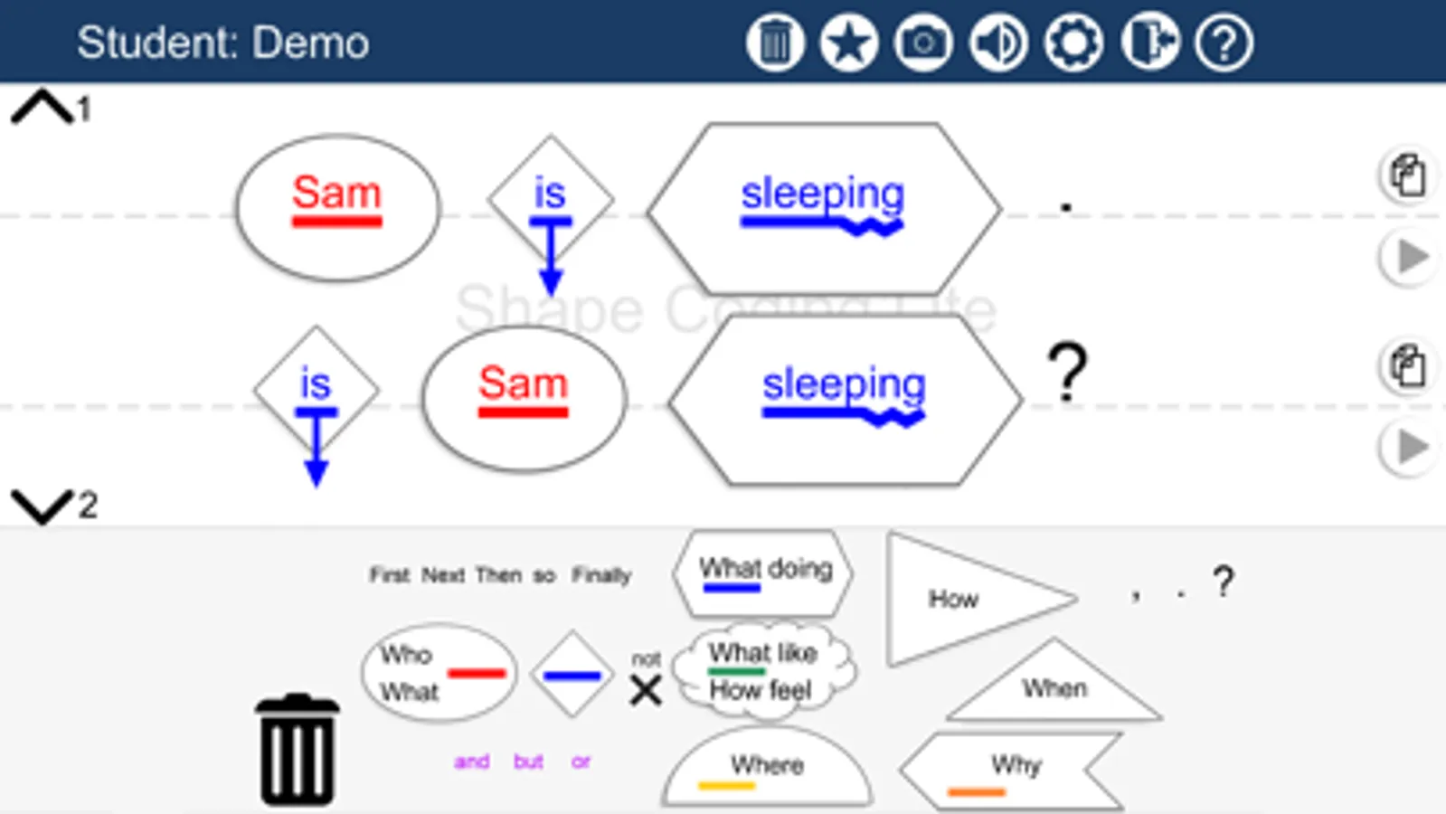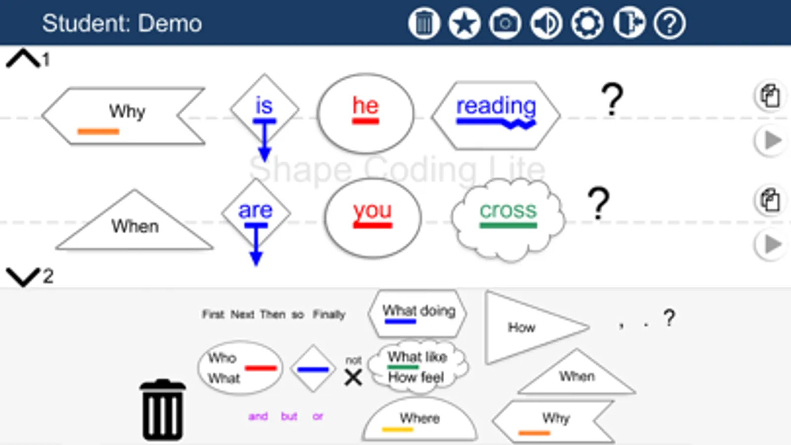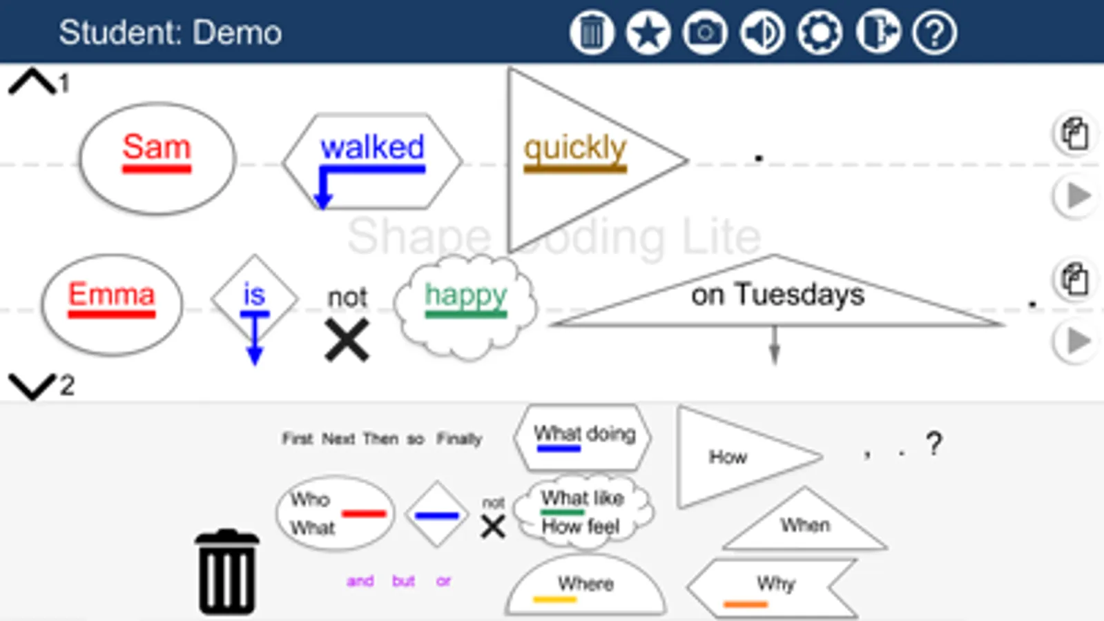 The SHAPE CODING system uses a visual coding system to show the rules for how words are put together in sentences, to develop the child’s understanding of spoken and written grammar and to develop their ability to use grammar successfully to express themselves. The system includes use of colours (parts of speech), arrows (tense and aspect) , lines (singular and plural) and shapes (syntactic structure). These are all included in the app (although not all are enabled in the Lite version), but the professional controlling the app can choose which features display for the student, so that it is personalised to their current levels and targets. Settings are preserved for the student between uses. The Lite app allows only a single teacher and student, but the full version can have multiple teachers and students.
