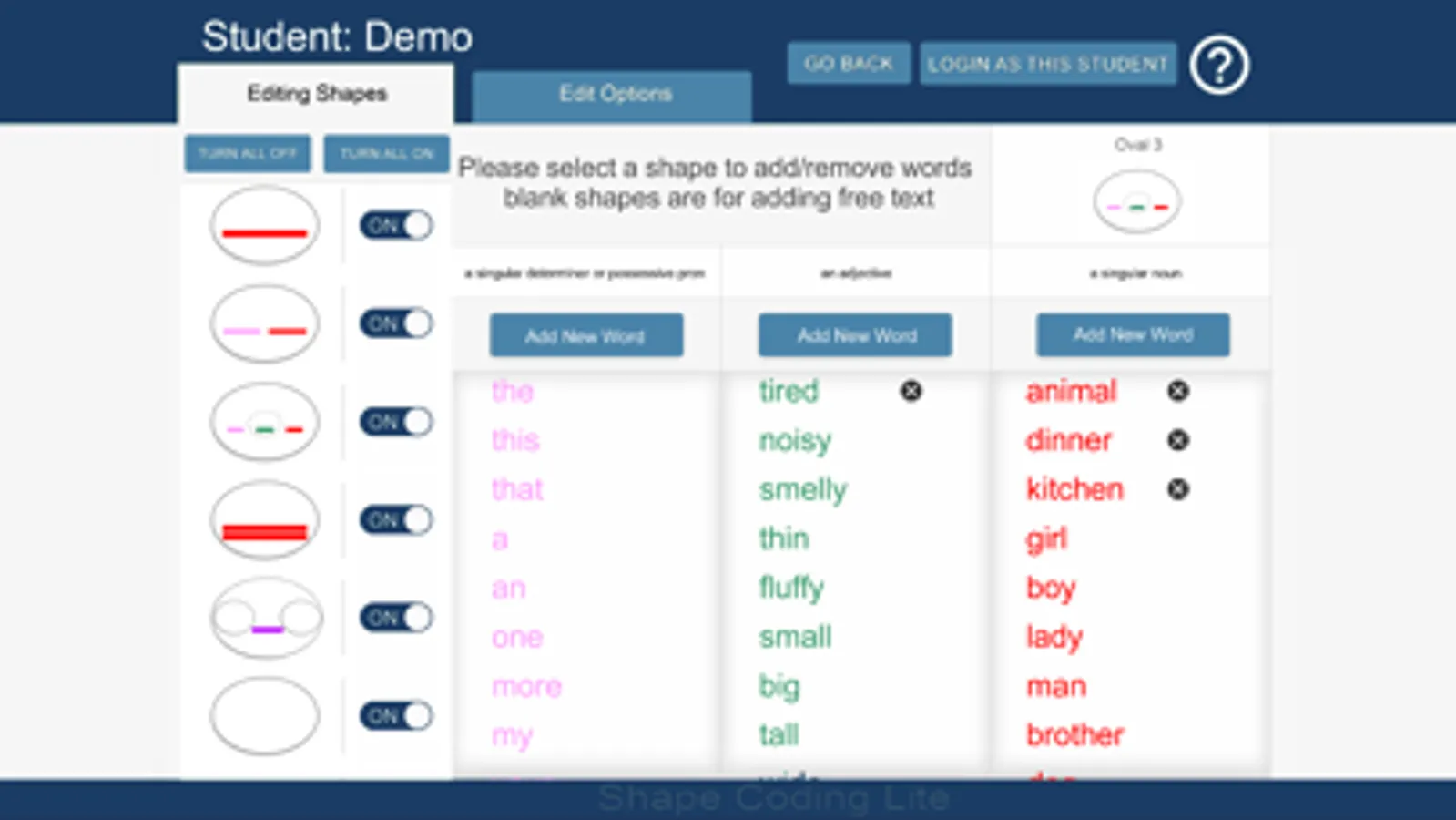The Shape Coding Lite app is equipped with a basic set of words which can be inserted into those shapes which are enabled to make simple sentences. A much wider range of shape options are enabled in the full version than the Lite version, so more grammatical rules can be taught and more complex sentences created.