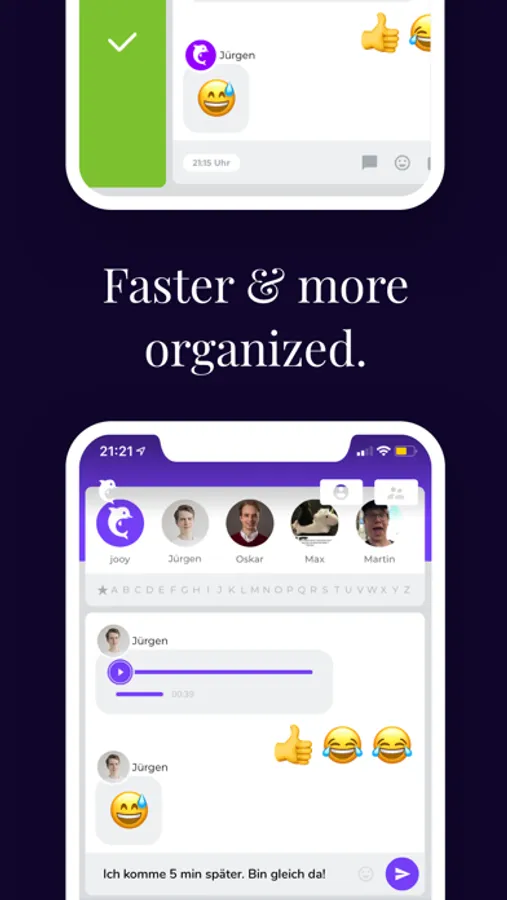 Messaging App rethought from the ground up, to end a decade without innovation in the most used category of apps. jooy allows to communicate faster, more comfortable and with more overview thanks to an entirely new interface. Furthermore, we follow the vision that speech communication done right, can become the dominant form of communication. That's why we focus on creating the best possible experience for speech communication. Last but not least, we introduced helpful new features, which built on the fact that your close friends are on the same platform.