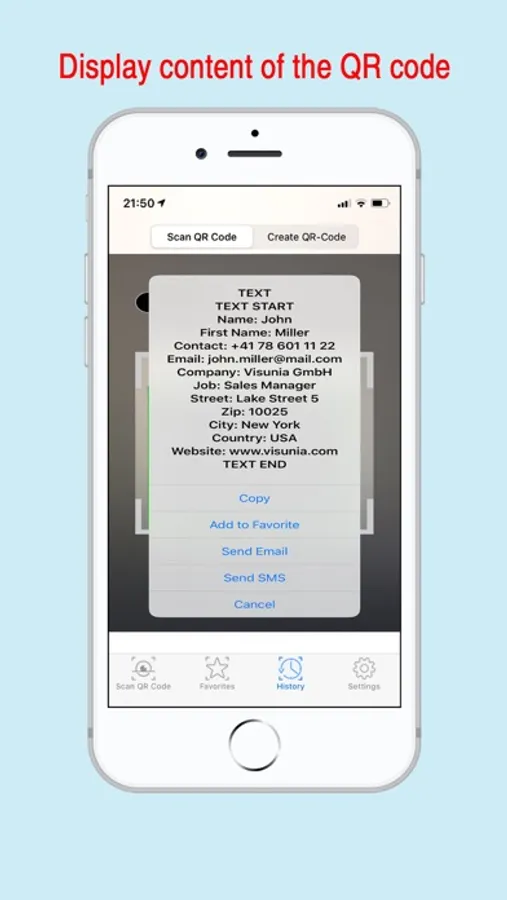 Simply start the app and point the camera at the QR Code. The app reads all formats like text, links, SMS, contact data etc. If you enter a URL, the corresponding web page can be opened directly.
