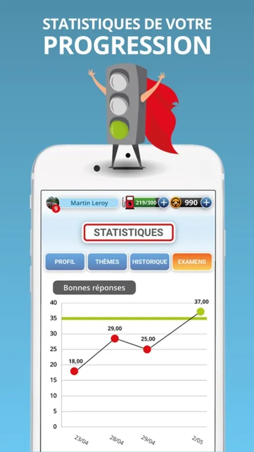 • Suivez votre progression thème par thème grâce aux statistiques et à votre historique