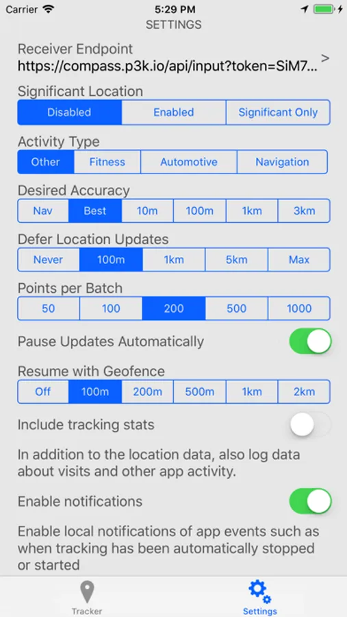 Highly configurable tracking settings for optimal control. Choose between getting highly detailed track logs (and using tons of battery in the process), or tracking only significant movements allowing you to conserve battery life.