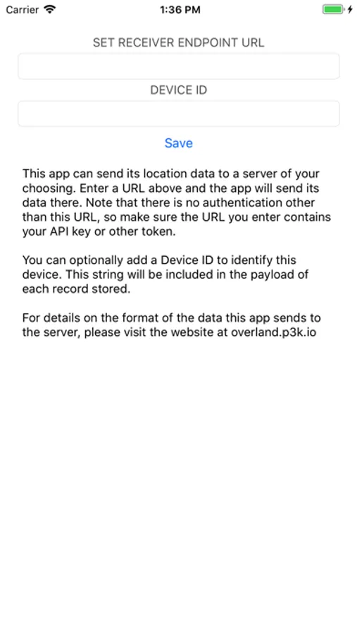 Overland tracks your location and sends your data to a server of your choosing. The app will save data while you're offline, and send it to the server later in batches.