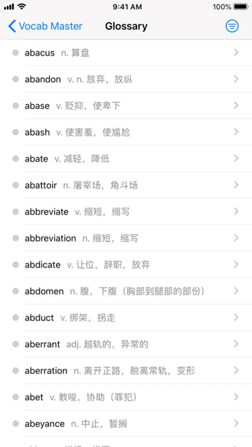 Vocab Master is designed to help Chinese students quickly memorize the vocabularies for various English tests.