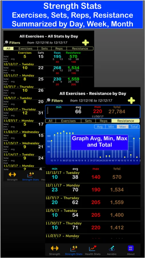• Explore strength progress with wizFIT’s powerful statistics dashboard.