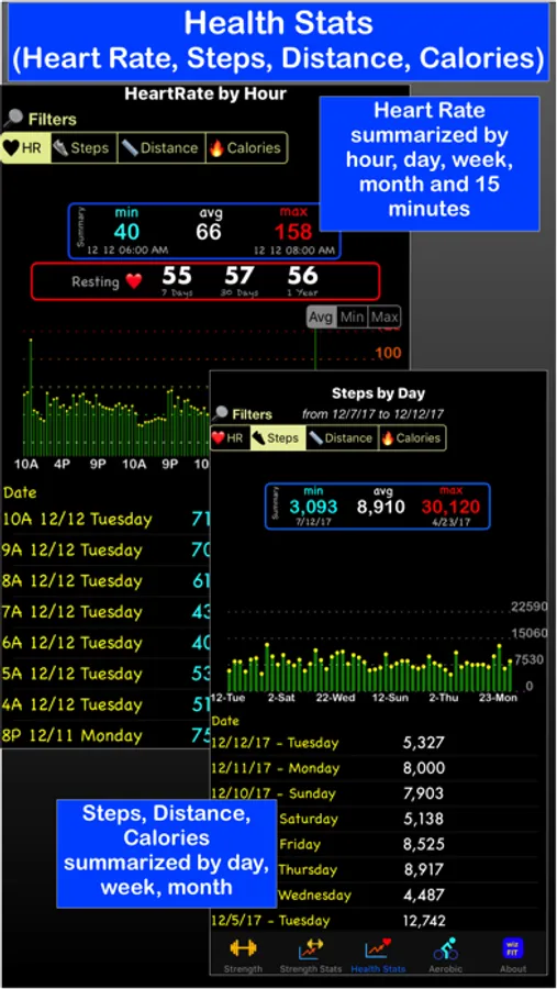- Interactive charts of heart rate, steps, distance and calories burned.