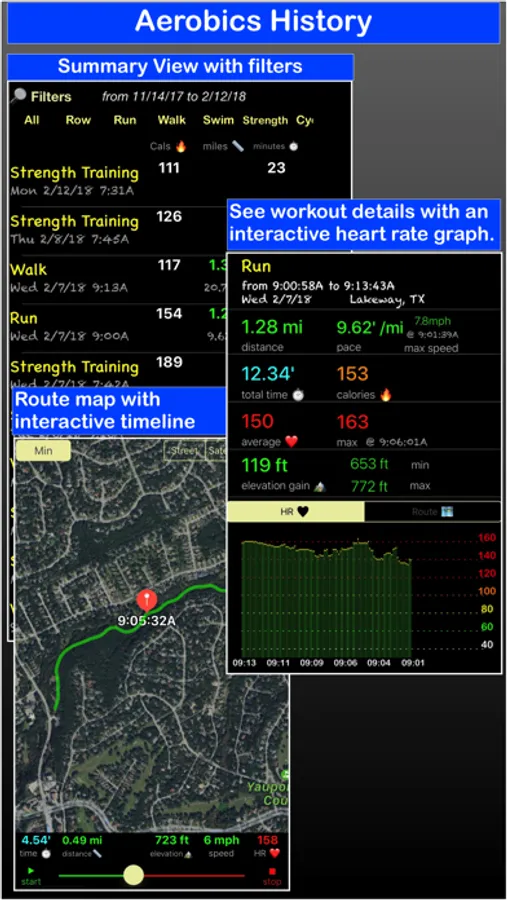 • Explore aerobics history as provided by the Apple Activity App (run, bike, swim, bike, yoga, etc.). View calories burned, distance, pace, speed, duration, max/avg HR, start/end times, elevation min/max/gain.