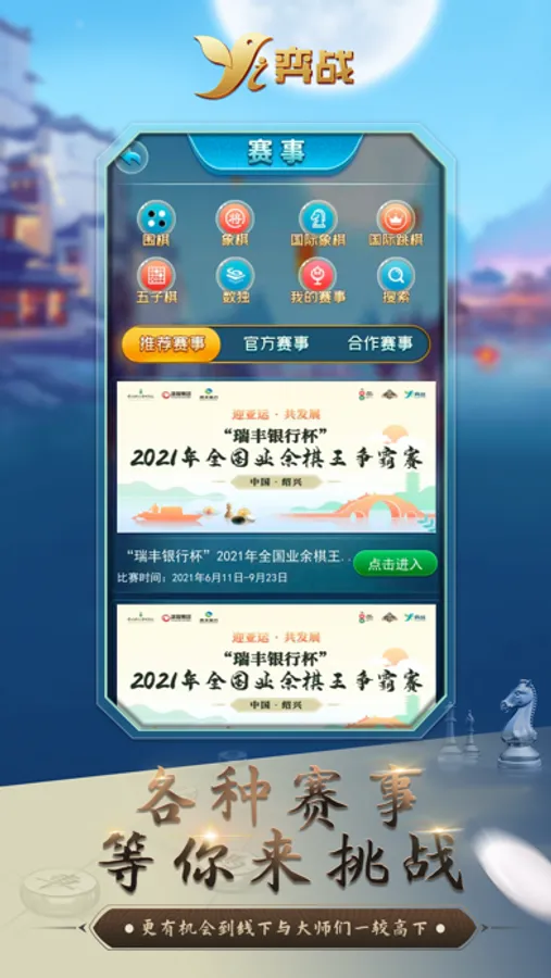 弈战是一个专业权威的棋类赛事平台,且具有丰富的棋类游戏对弈功能,包含围棋、象棋、国际象棋、五子棋、国际跳棋、数独等,棋友可以进行各类赛事线上比赛,也可进入不同的游戏对战全国高手,是广大棋类爱好者感受棋类游戏乐趣的最佳选择;