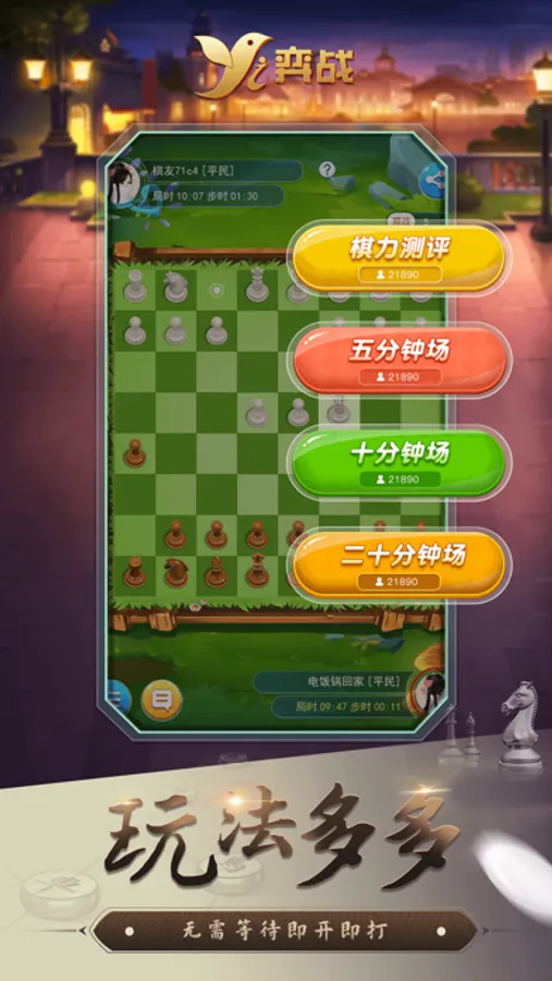 分为:棋力评测场、5分钟场、10分钟场、30分钟场,随时匹配无需等待;