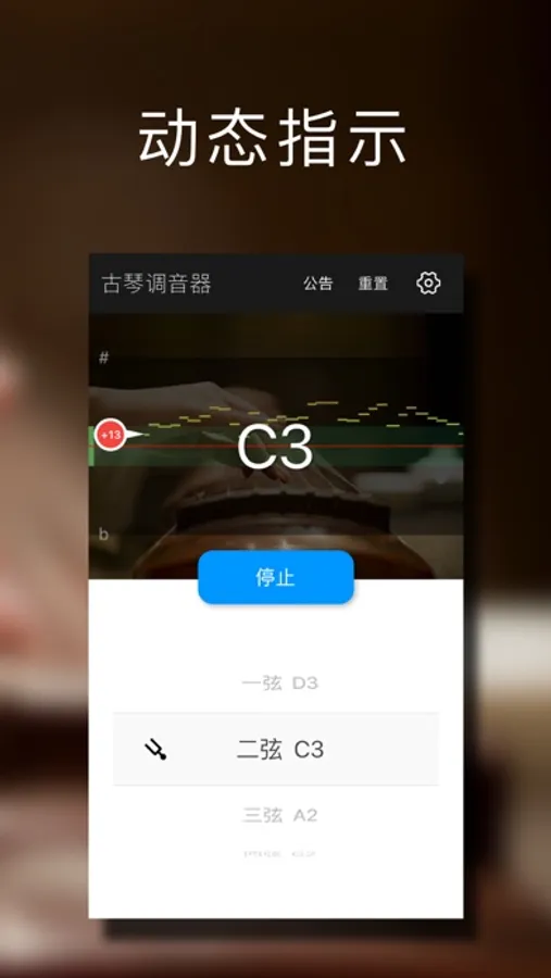 - 动态指示,系统会动态指示当前弦音的位置,是偏高还是偏低。