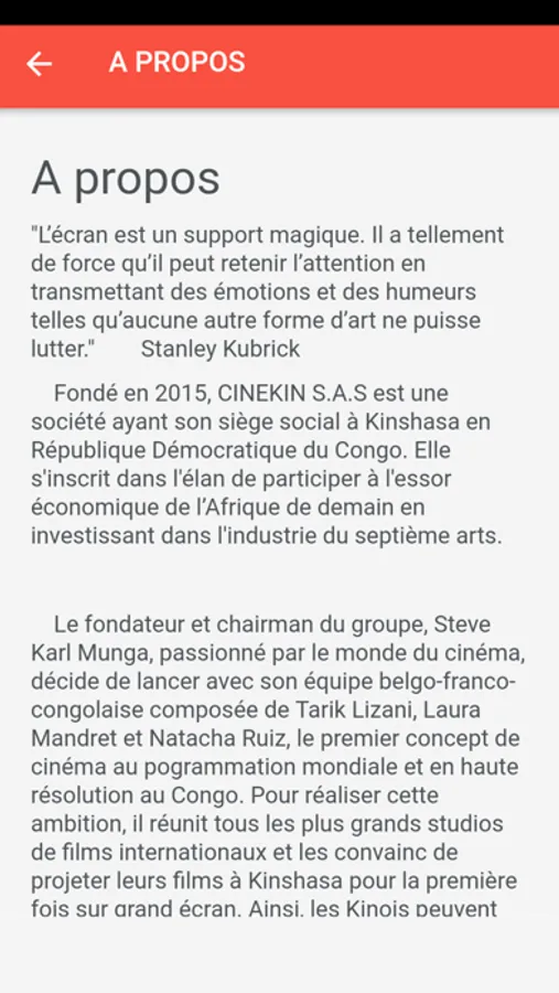 Le fondateur et chairman du groupe, Steve Karl Munga, passionné par le monde du cinéma, décide de lancer avec son équipe belgo-franco-congolaise composée de Tarik Lizani, Laura Mandret et Natacha Ruiz, le premier concept de cinéma au pogrammation mondiale et en haute résolution au Congo. Pour réaliser cette ambition, il réunit tous les plus grands studios de films internationaux et les convainc de projeter leurs films à Kinshasa pour la première fois sur grand écran. Ainsi, les Kinois peuvent vivre l'expérience magique qu'offre le cinéma haute qualité, l'une des industries les plus spectaculaires et importantes au monde.