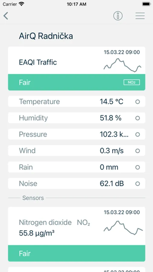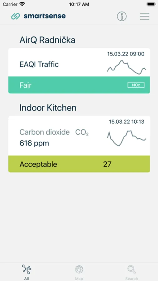 Sensees application connects to the smart sensor platform for monitoring multiple air quality parameters in the indoor and outdoor environment. From relative humidity, temperature and CO2 levels in indoor facilities to additional measurement of atmospheric pressure, CO, NO, SO2, O3 and airborne particles, we offer insight into the air quality around you. Presented air quality parameters are measured by Smart sense stations. For login use username and password provided with your station.