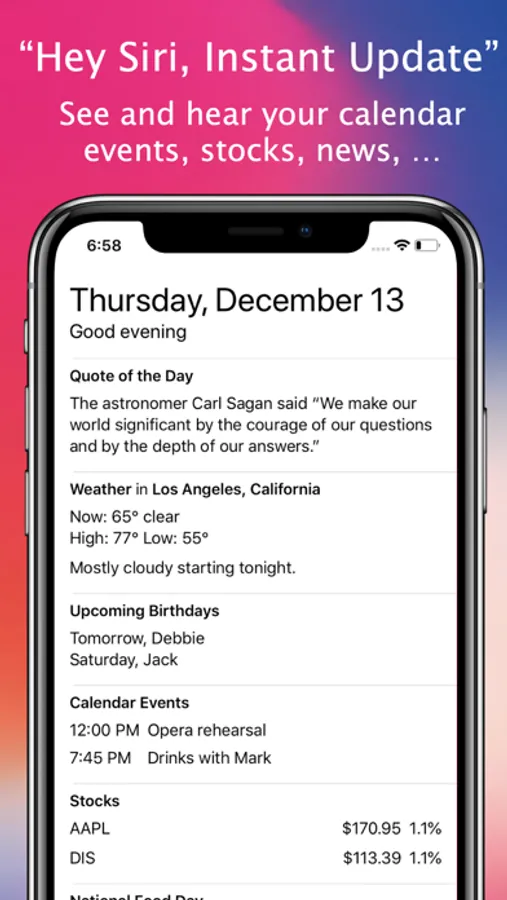 Get an instant summary of your day: weather forecast, calendar events, upcoming birthdays, stock market quotes, and more. Easily customize the information you want to see. Add a Siri Shortcut to have your summary read out aloud without lifting a finger.