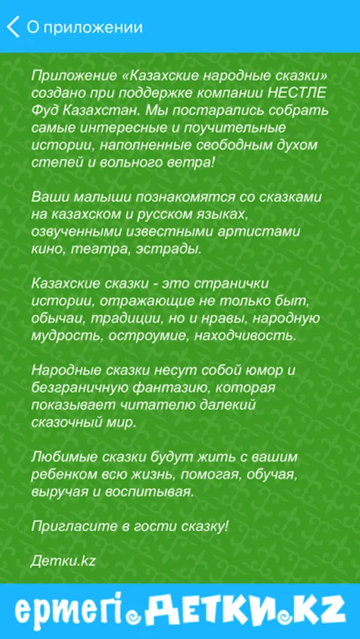 Приложение «Казахские народные сказки» создано при поддержке компании «НЕСТЛЕ Фуд Казахстан». Мы постарались собрать самые интересные и поучительные истории, наполненных свободным духом степей и вольного ветра!