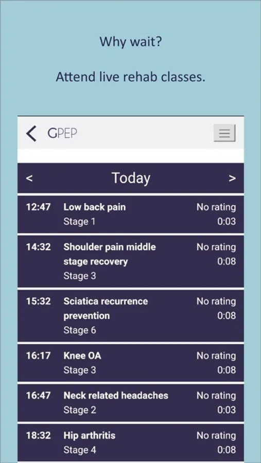 Stop waiting for conventional healthcare and start your recovery right now. GPEP have reimagined muscle and joint rehab so that you can expect better and feel better. GPEP helps you access a wealth of clinical expertise, enabling you to create a programme of rehab exercises with the option of attending live classes and connects you to a community that can offer shared experience and support along the way. Download GPEP and start your recovery today.