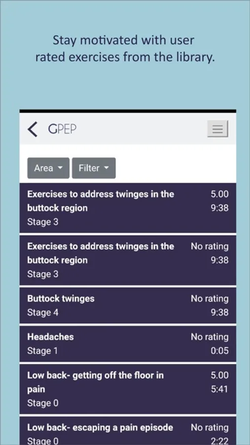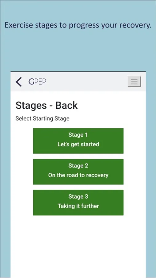 Simply select the body part affected (back, shoulder, hip, knee, neck, elbow, calf & foot) and undertake a series of videos appropriate for you in real time. GPEP enables you to monitor your process through the completion and satisfaction tracker. It’s really simple!